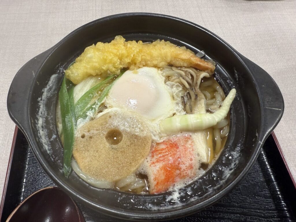 宿へ向かう前に、まずは腹ごしらえ。冬の鬼怒川の冷たい風に吹かれていると、自然と体が温かいものを欲してきます。 駅前を散策していると、どこからか出汁のいい香りが漂ってきました。吸い寄せられるように入ったレストランで、迷わず注文したのは「鍋焼きうどん」です。