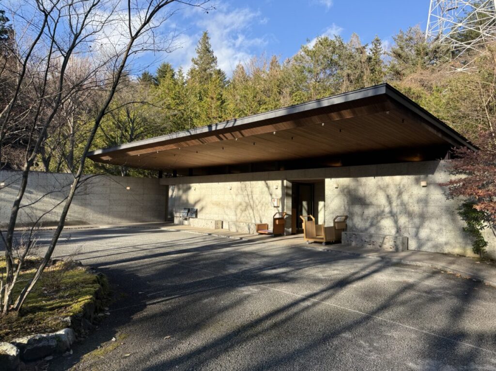 「あ、見えた!」と期待に胸を膨らませて到着したエントランス。しかし、驚いたことにそこにはまだ建物がありません。 実は「界 鬼怒川」のロビーは、小高い丘の上に位置しており、そこへ行くためには専用のスロープカー(ロープウェイ)に乗る必要があるんです。