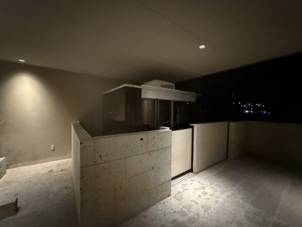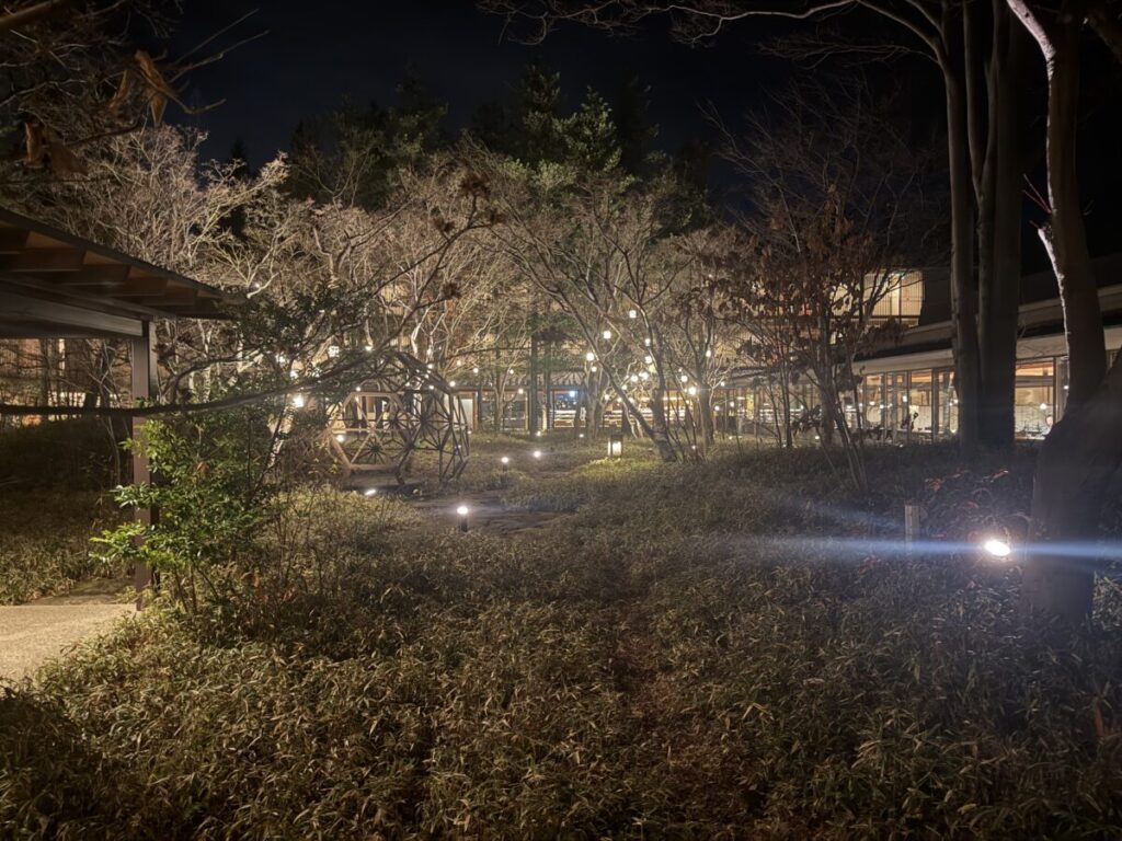 食事会場へと向かうため、一度お部屋を出て廊下を進みます。すると、昼間に歩いたあの中庭が、夜の帳が下りるとともに幻想的な光の庭へとその姿を変えていました。