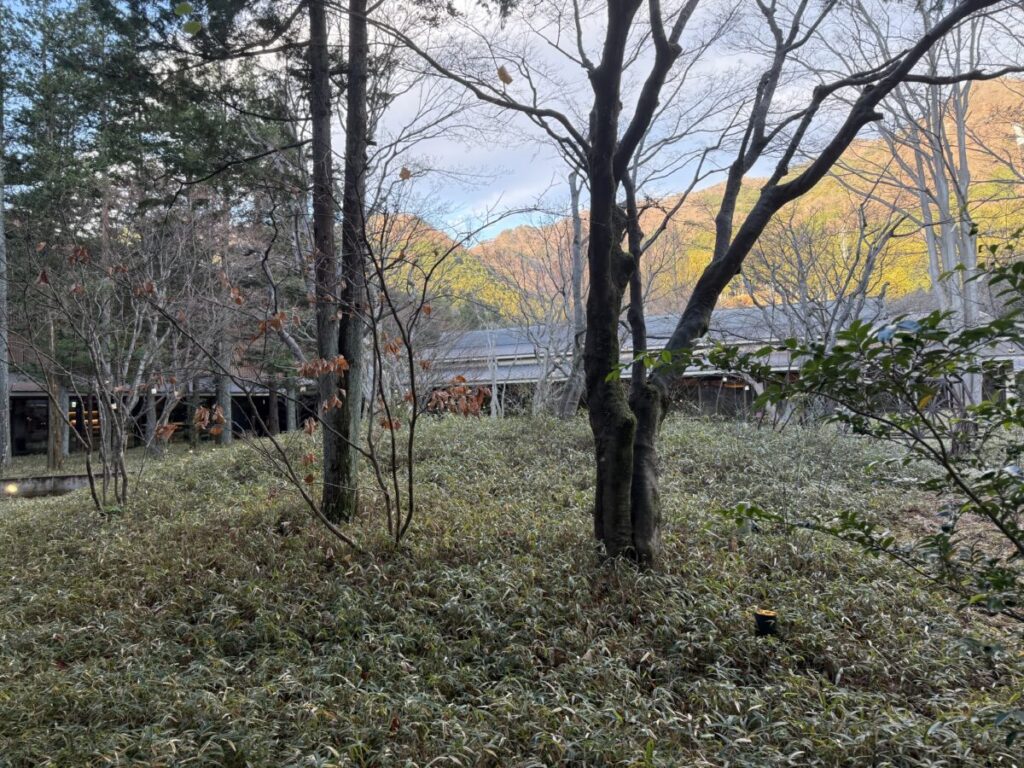 ついに辿り着いた「界 鬼怒川」のエントランス。そこで私たちを真っ先に迎えてくれたのは、息を呑むほどに美しい中庭の景色でした。