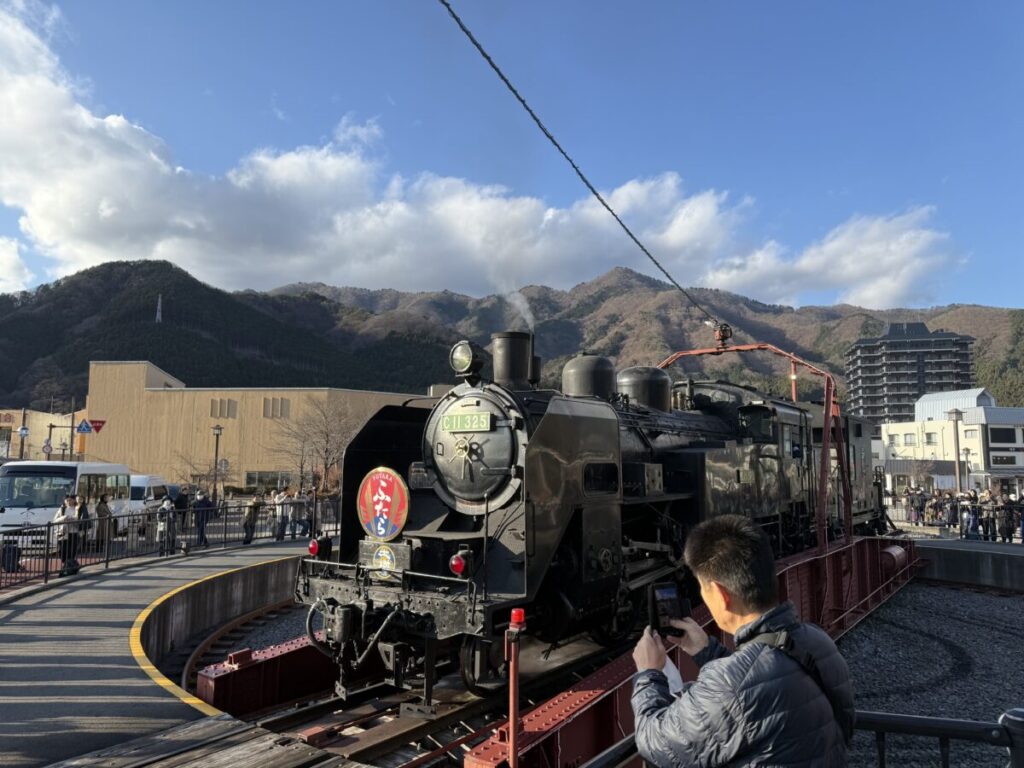 お昼ごはんを終えて駅前の広場に向かうと、そこには今回の旅のフィナーレを飾るにふさわしい、SL大樹(たいじゅ)が、まさに出発しようとしている瞬間に立ち会うことができたのです!