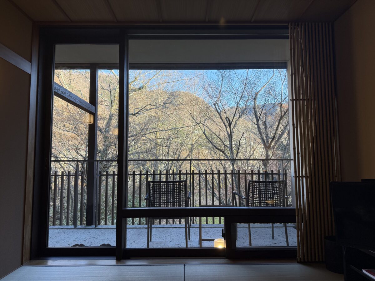 窓の向こう側に広がっていたのは、冬の装いを見せる鬼怒川のありのままの自然でした。12月の少し寂しげで、でも凛とした表情の山々や木々が、まるで大きなスクリーンに映し出された映画のように目の前に迫ります。
